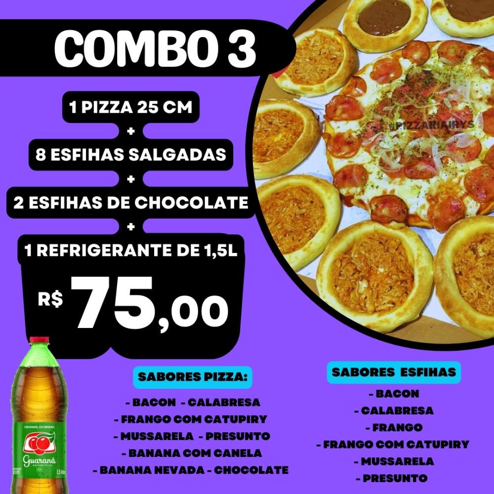 1 PIZZA (25cm) 1 sabor: Calabresa / Frango / Mussarela / Presunto + 8 ESFIHAS SALGADAS: Calabresa / Presunto / Queijo / Frango + 2 ESFIHAS DOCES: Chocolate + 1 REFRIGERANTE de 1,5L
